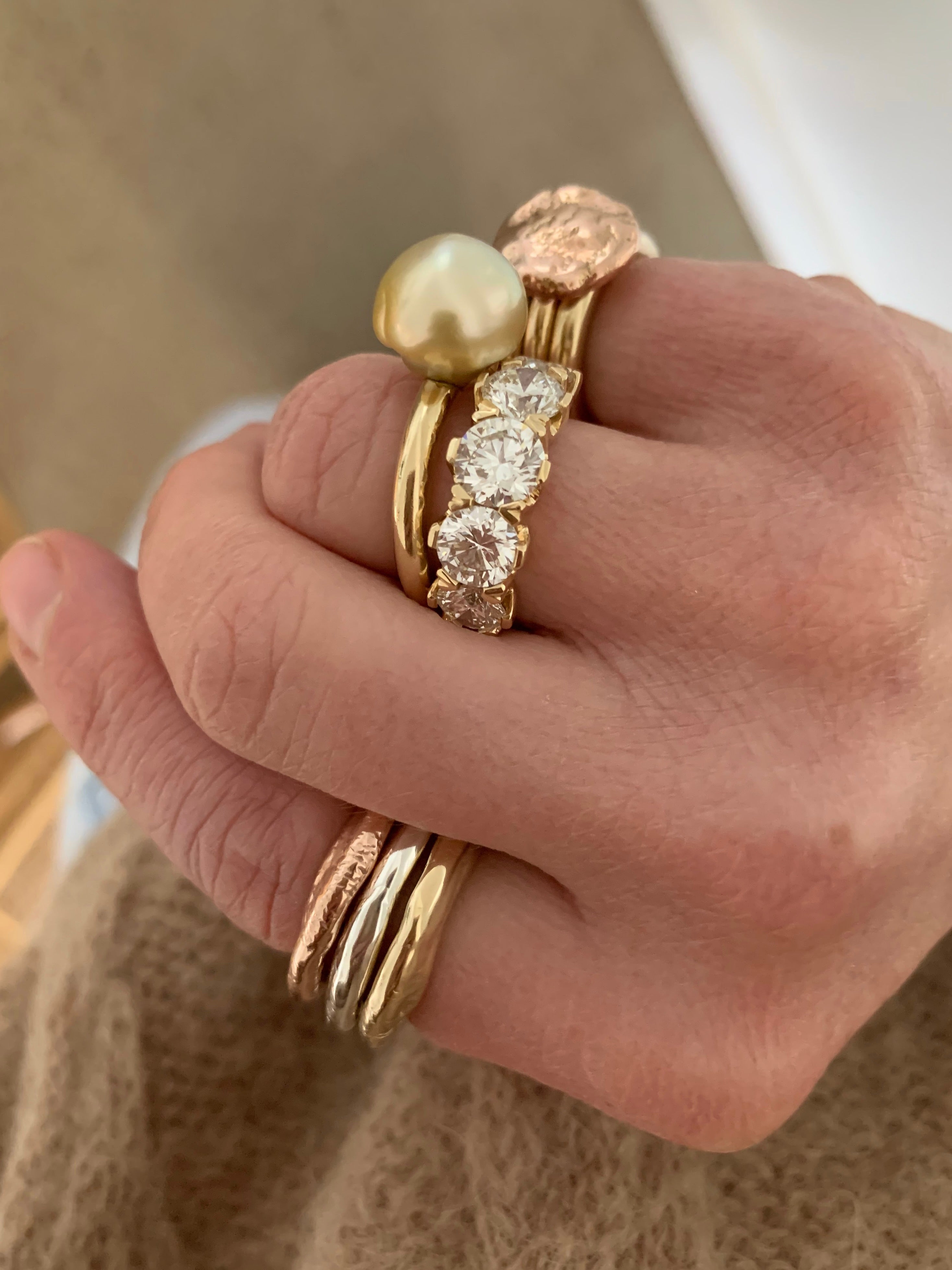 Taking cues from our textured pieces, we love these rings for something a little unique and for their organic form. Gorgeous worn solo or stacked as a three-tone or with other styles. A slightly thicker organic band.