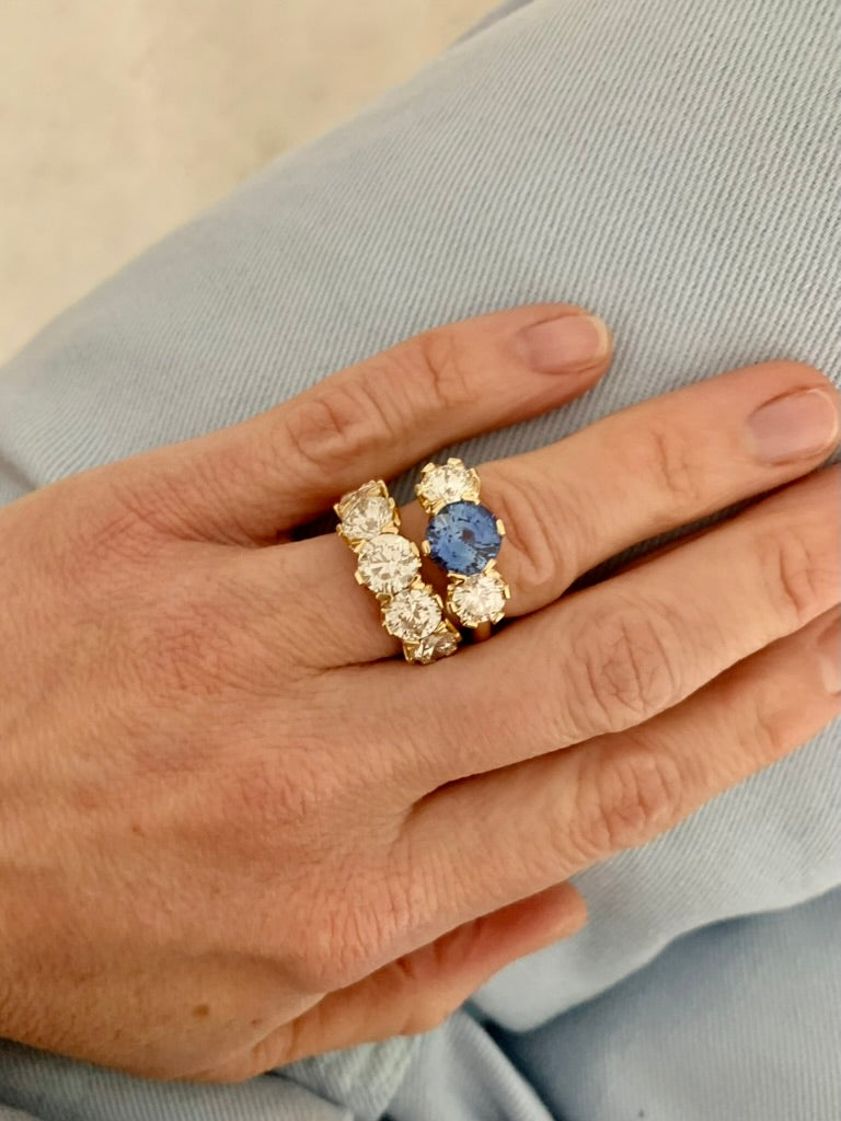 Blue sapphire (8.4mm/3.08ct) and diamond (0.81ct) trilogy.